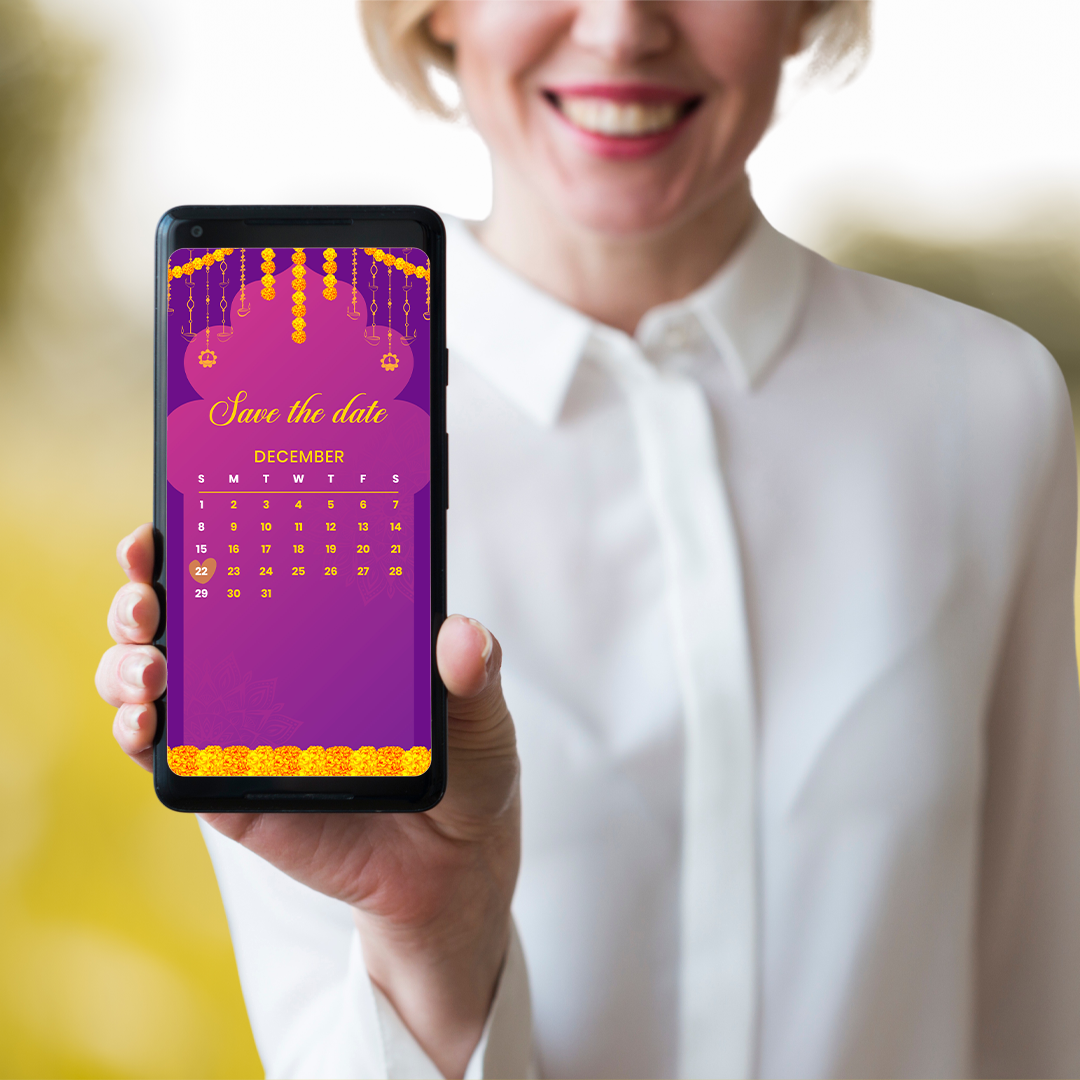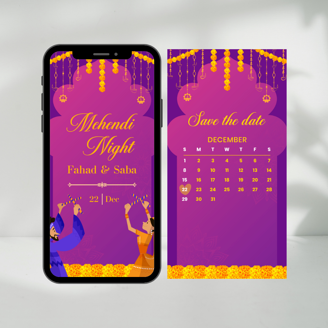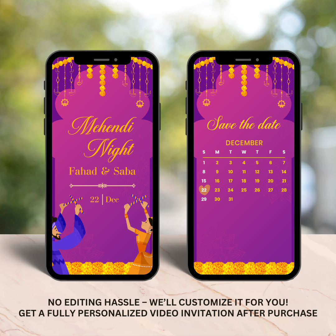 Get ready to celebrate your Mehndi night in style with this vibrant animated MP4 invitation! Featuring the cheerful touch of yellow genda phool against a backdrop of purple and blue, this lively design sets the perfect tone for your pre-wedding festivities. Let your guests feel the excitement and joy even before the celebration begins.